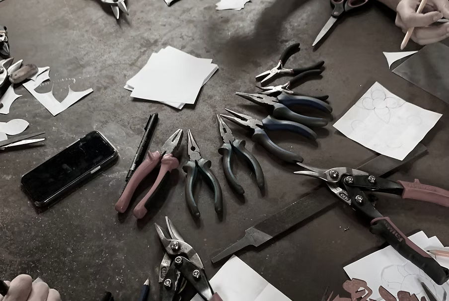 Du kommer att tilldelas ett pappersark och en lika stor bit plåt. En del av utmaningen är att använda materialet så mycket som möjligt. Först skissar du och skär i papper. När du hittat en form som du gillar överför du den till biten metall som du skär med olika plåtsaxar och formar med hjälp av tång, hammare och städ. Jag hjälper till med eventuell svetsning.
